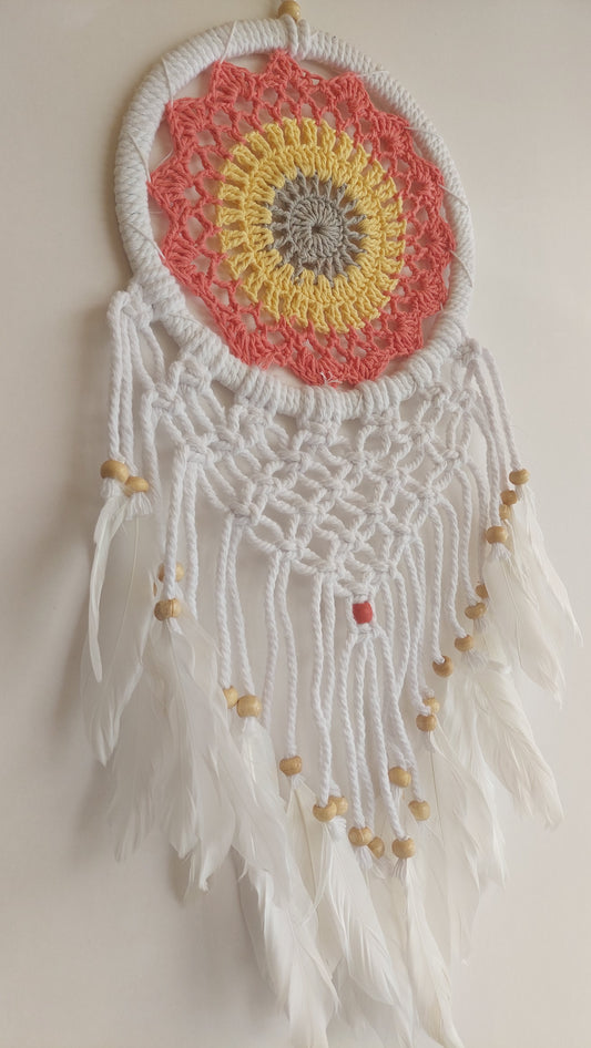 Atrapasueños Blanco Macrame y Plumas (rojo y amarillo)