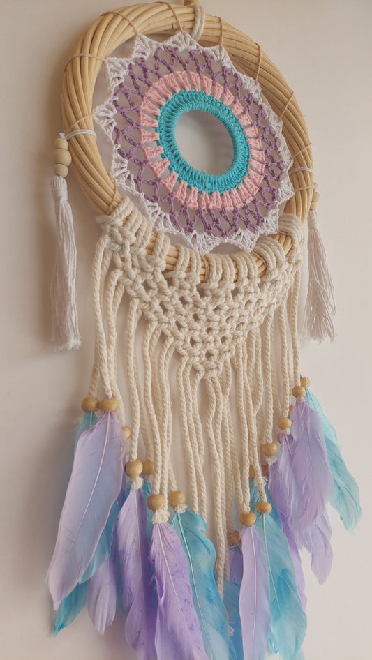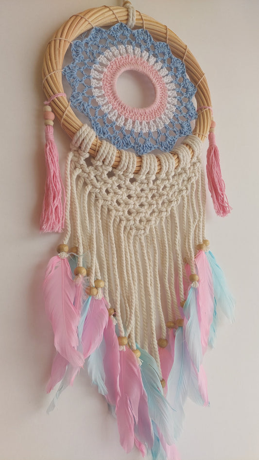 Atrapasueños Aro Bambú Macrame y Plumas (celeste y rosa)