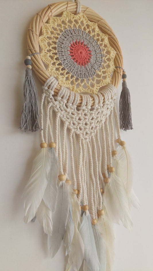 Atrapasueños Aro Bambú Macrame y Plumas (amarillo y gris)