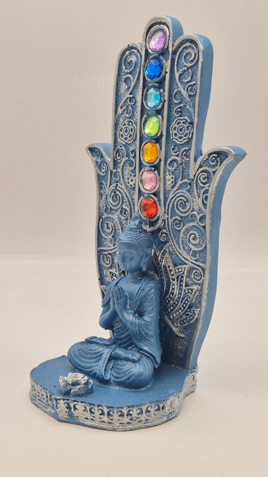Buda con Manos en Pecho "Mudra Pranan" con Mano de Hamsa (azul)