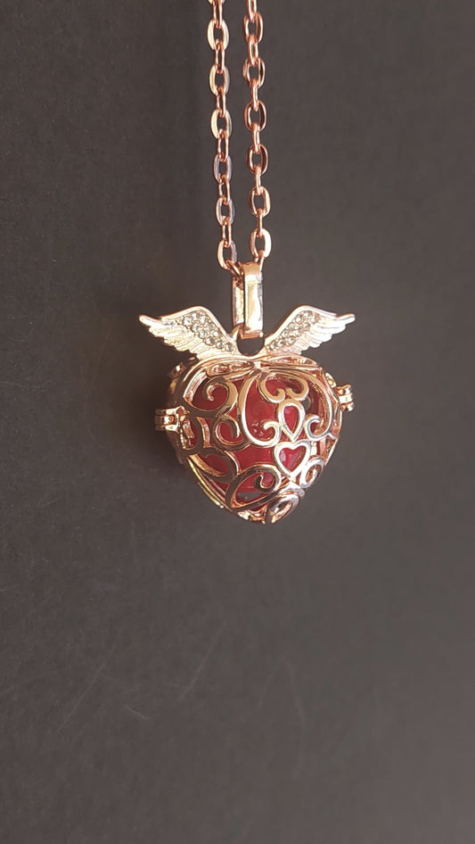 Llamador de Ángeles / Corazón 2 alas ORO ROSA cascabel rojo