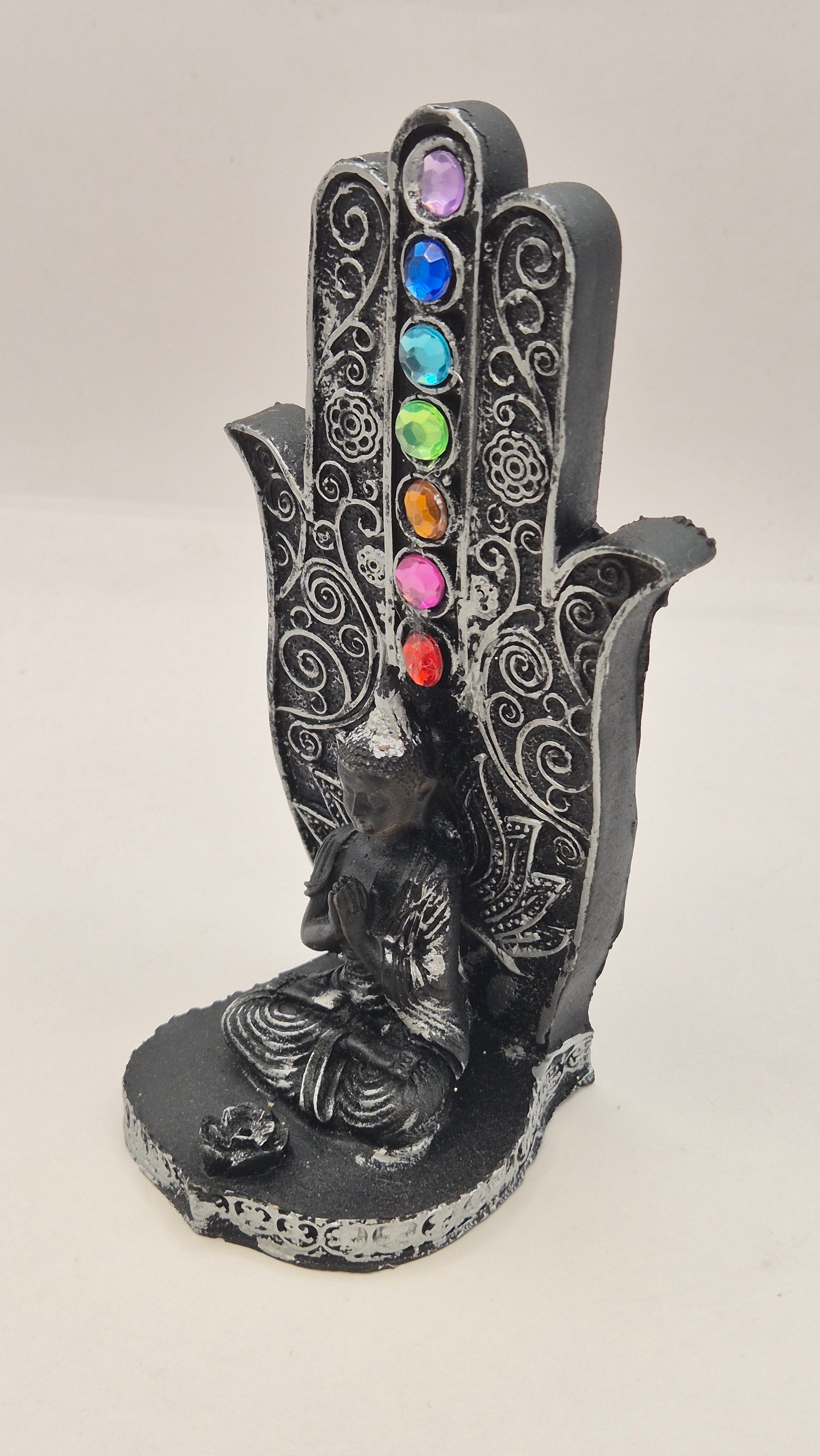 Buda con Manos en Pecho "Mudra Pranan" con Mano de Hamsa (negro)