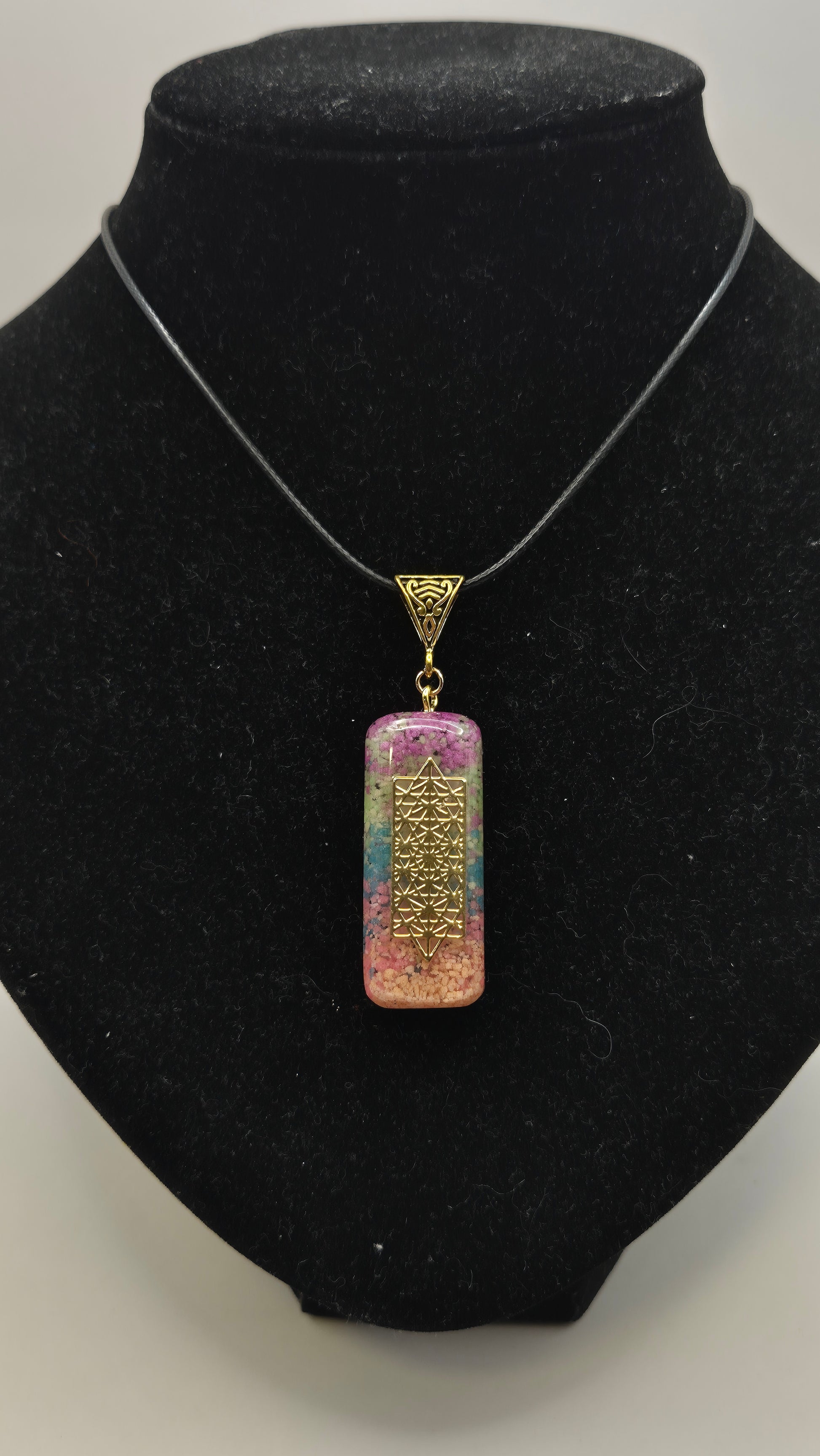 Un dije de orgonita es una conexión entre materiales orgánicos que incluyen gemas, metales y resinas. Los metales aseguran que las gemas tengan un reflejo. De esta forma el efecto de las piedras se vuelve mucho más fuerte. La orgonita en sí misma convierte las energías negativas en energía positiva y purifica la atmósfera en el espacio. Funciona como protección contra radiaciones nocivas como WiFi y 5G. También asegura un mejor descanso por la noche debido al medio ambiente puro.